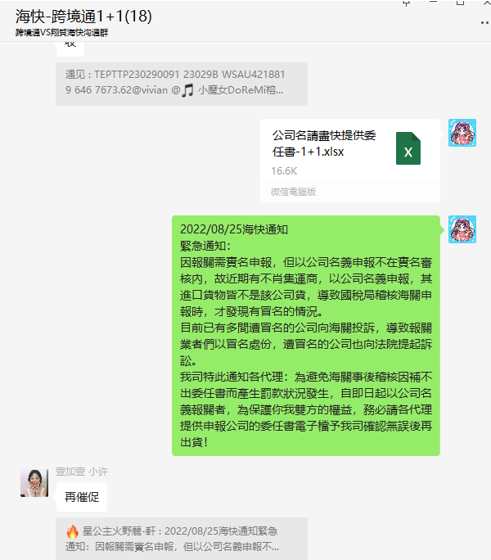 我司特此通知各代理:為避免海關事後稽核因補不出委任書而產生罰款狀況發生,自即日起以公司名義報關者,為保護你我雙方的權益,務必請各代理提供申報公司的委任書電子檔予我司確認無誤後再出貨!