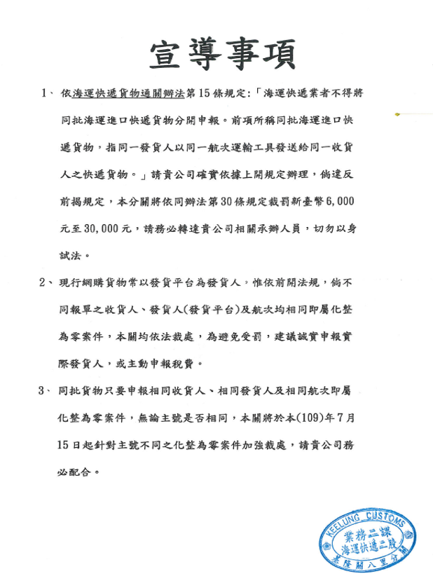 『化整為零』只要申報人/面單其中一項符合海關即可裁罰,請參閱以下公文