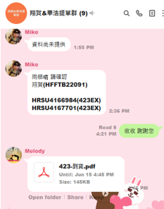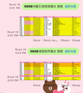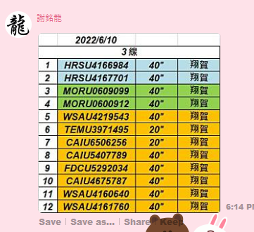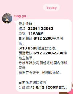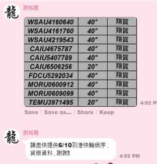 龍哥確認可以會再回覆如圖,此為實際清關櫃序。