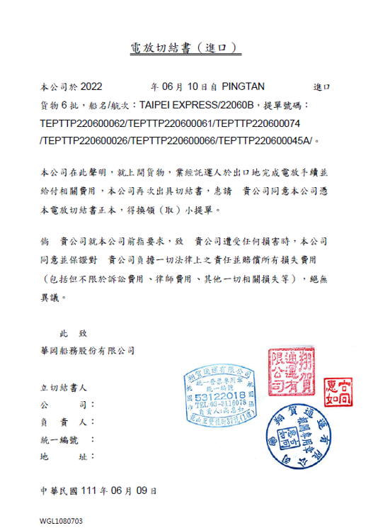 台北快輪有電放切結與擔保提貨,需蓋章掃描回傳並寄回(可以兩周寄一次)