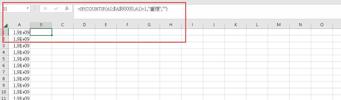 重複值公式=IF(COUNTIF(A1:$A$80000,A1)>1,”重複”,””)