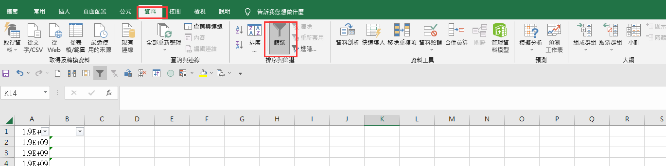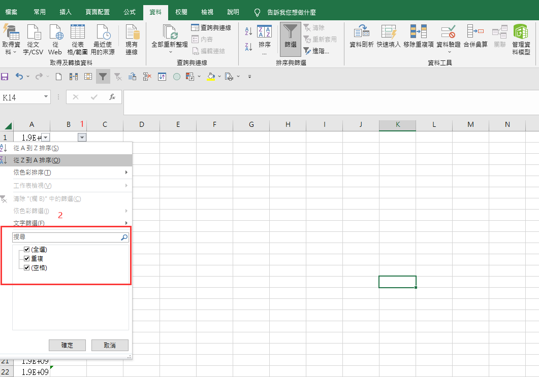 第五步 點選第一行 使用資料-點開篩選確認紅框中 有無重複